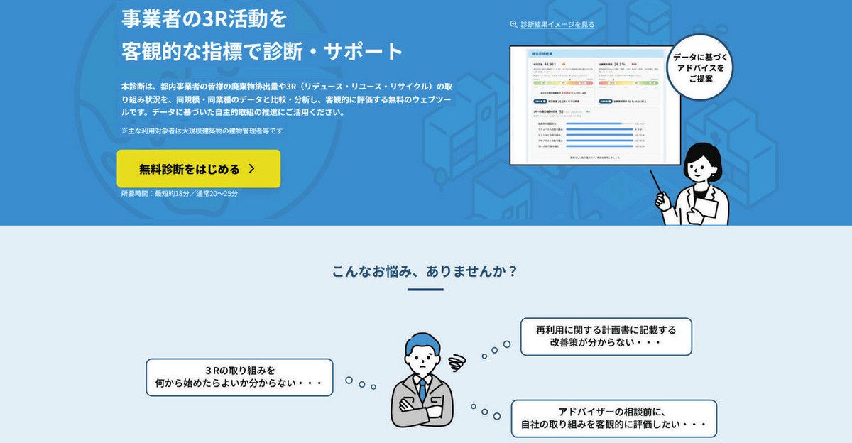 東京都は1日、事業所が自社のごみ減量やリサイクルの取り組み状況を手軽に診断できるオンラインツール「TOKYO 3R診断ナビ」を公開した...