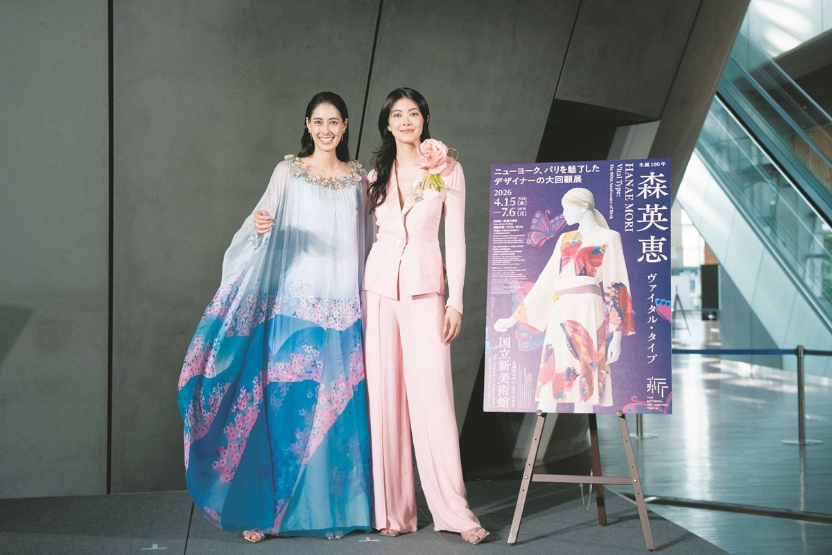 「生誕100年森英恵ヴァイタル・タイプ」の開会式に登場した森星さん(右)と森泉さん=14日、東京都港区の国立新美術館で