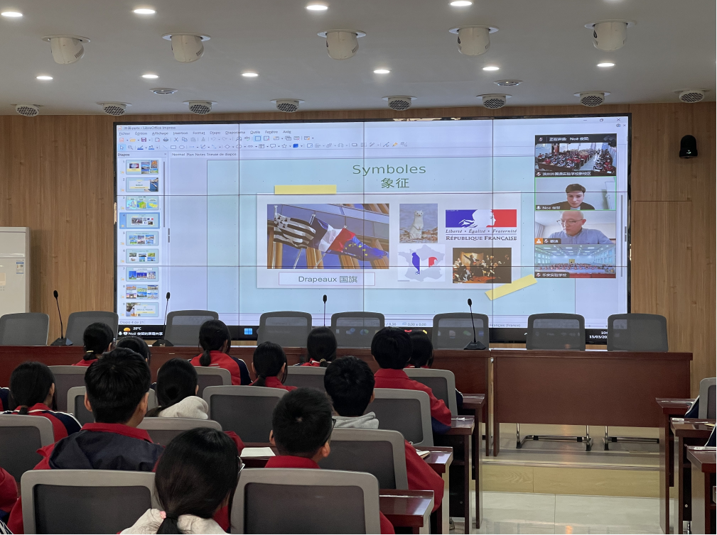 活動開始時、フランスのサン・ガブリエル・アカデミーの助教・Noë(ノエ)先生が中国人の生徒たちにフランス文化について素晴らしい授業を行った。Noë(ノエ)先生は、フランスの地理的位置、フランス国旗の歴史的起源やそれを象徴している意義を詳しく説明することにより、生徒たちがフランスについてより直観的かつ深く理解できるようになった。