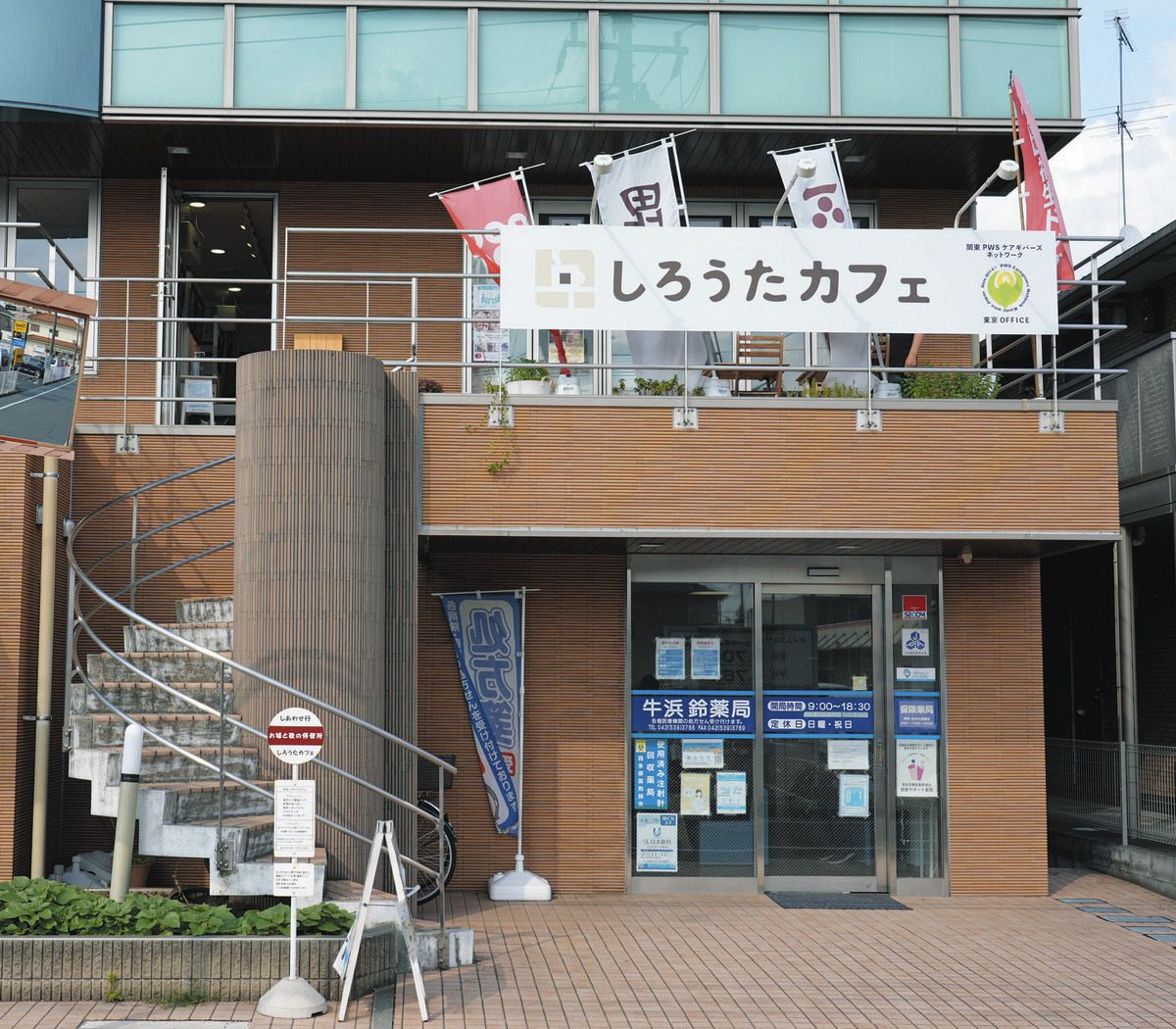 テラス席に、上杉謙信や真田幸村ののぼりがはためく。JR青梅線牛浜駅近くのカフェに入ると、城の写真が並んでいた。
