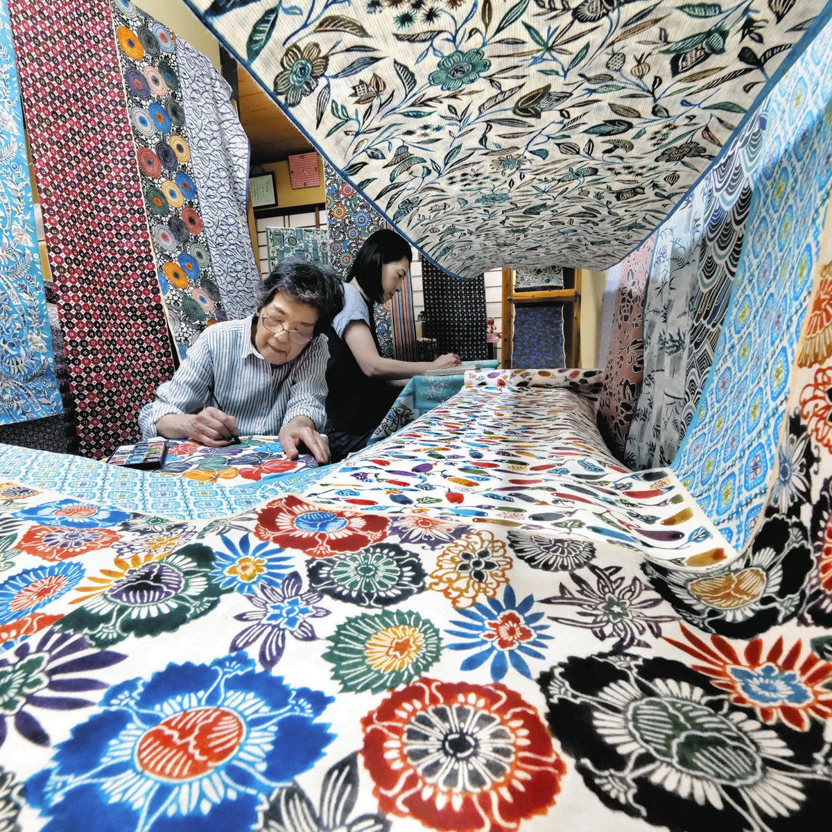 6代目の三橋京子さん(77)と長女で7代目の松本延子さん(53)が、相伝の2万枚以上ある型紙から制作した柄の一つ一つにハケで染色する。