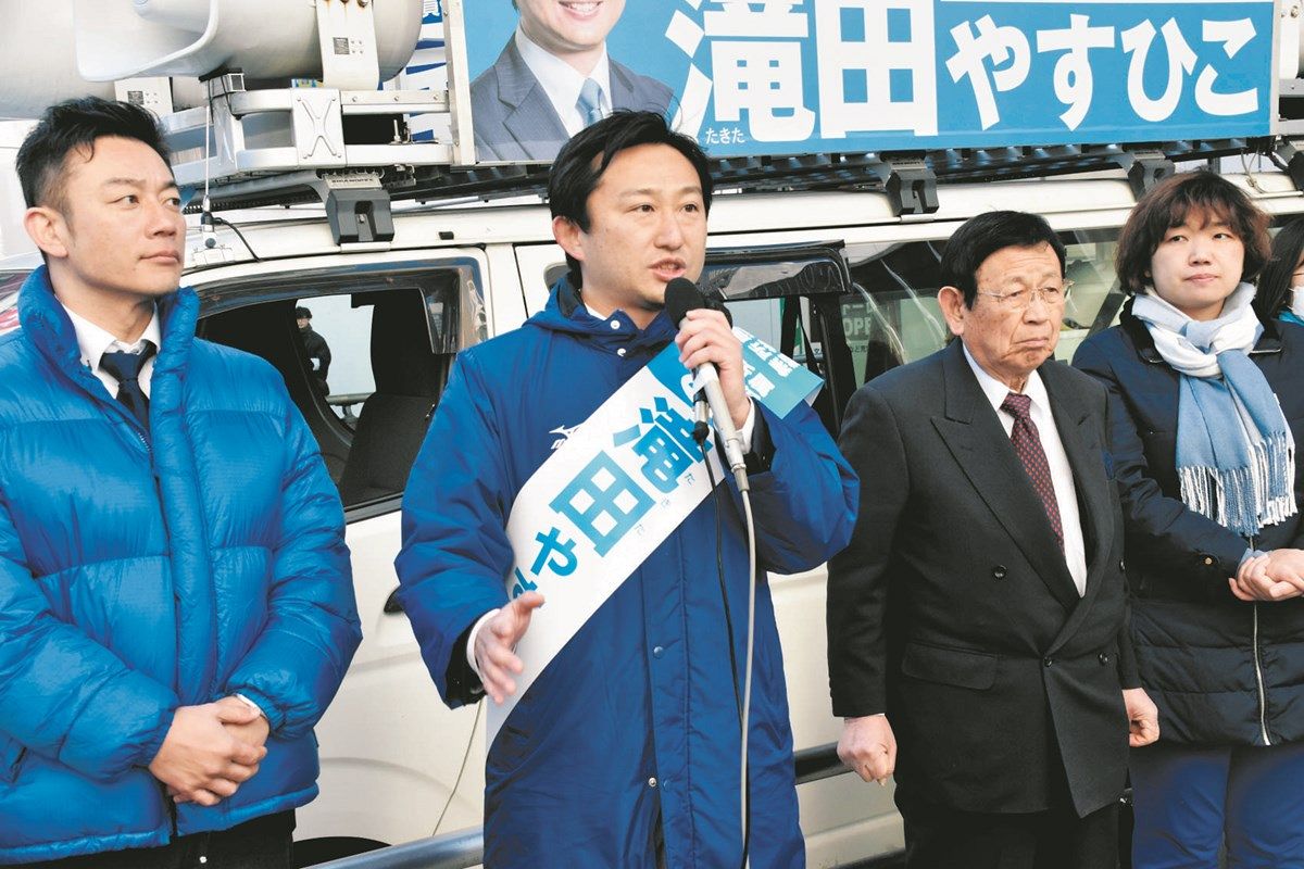 1月の市長選で演説する滝田泰彦氏=1月14日、東京都八王子市で(昆野夏子撮影)