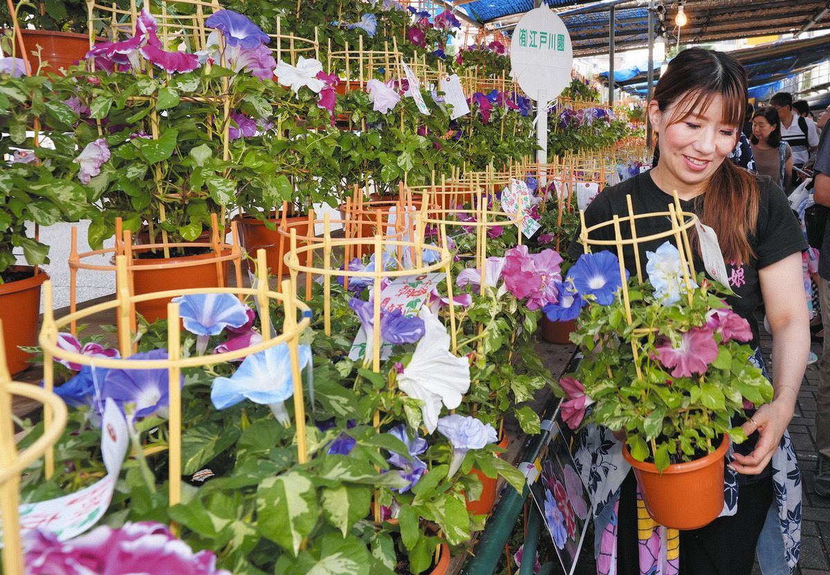 入谷朝顔組合の半谷(はんや)善之組合長(67)は「今年もできがいい」と笑顔。昨年は2日目の昼過ぎには売り切れたことから、早めの来場を呼びかける。午前4時ごろから午後9時過ぎまで店を開けるという。