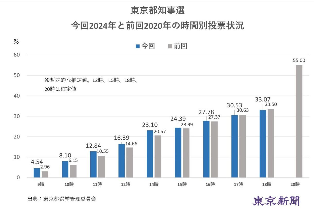 都選挙管理委員会によると、午後6時現在の期日前投票を除く投票率は33.07%で、2020年の前回都知事選の同時刻を0.43ポイント下回った。