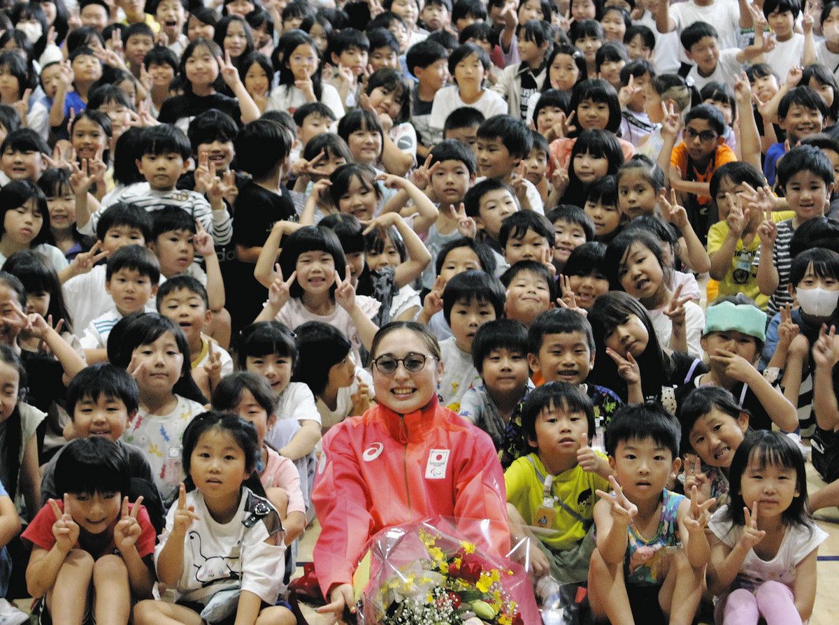 パリパラリンピックに向けて母校の児童からエールを送られる辻内彩野選手(手前中央)=江戸川区で