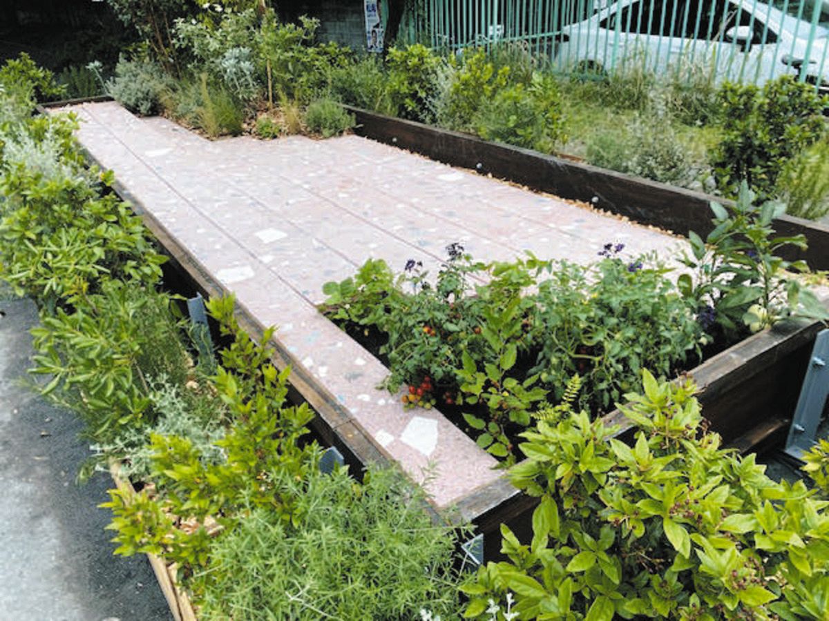 再整備に伴う舗装やベンチ整備に使われるのが、石材やレンガなどを粉砕して固めた人造大理石「テラゾー」。今回は、環境に配慮して廃材も活用しているという。本年度予算で舗装にかかる費用は1平方メートル当たり17万円。ベンチは、15基を整備するとして6240万円を計上しており、単純計算で1基416万円となる。