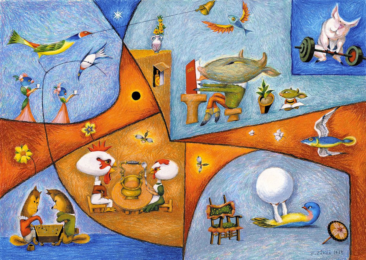 武井の一枚絵の特徴である、水彩とクレヨンが併用されたこの作品では、不思議な動物たちの世界を、幻想的な色彩で表現している。(目黒区美術館学芸員重田正惠)