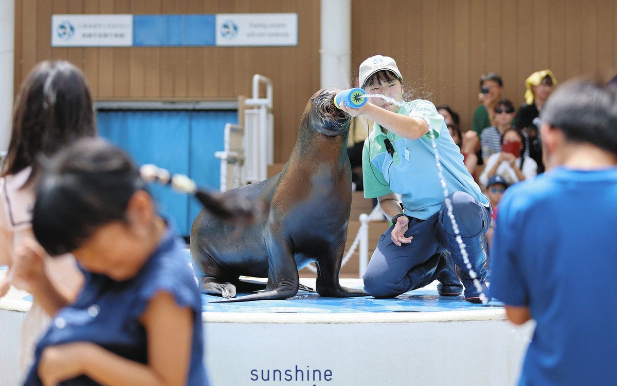 前足を使って滑るように移動すると、スタッフが手に持った水鉄砲を鼻で器用に押した。噴き出た水が、子どもたちに直撃。「キャー」「わー」と歓声が上がった。キンキンに冷やした氷水をかぶり、びしょぬれになった子どもたちは大はしゃぎだ。