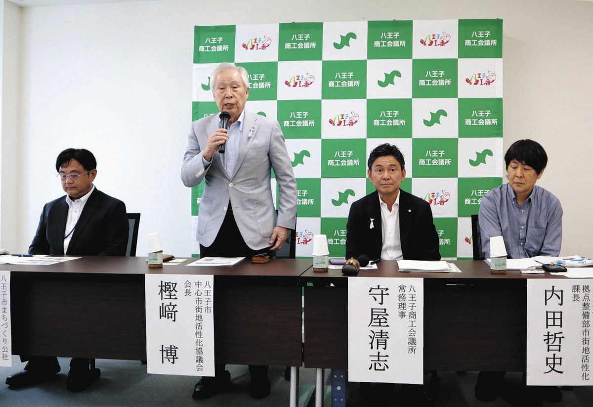プロジェクトを発表する樫崎博会頭(左)=東京都八王子市の八王子商工会議所で