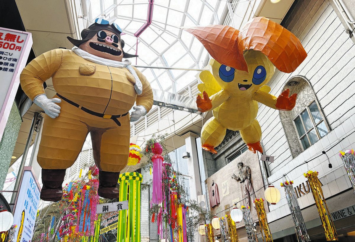 商店街に掲げられたキャラクターの張りぼてや吹き流しの飾り=東京都杉並区の阿佐谷パールセンターで