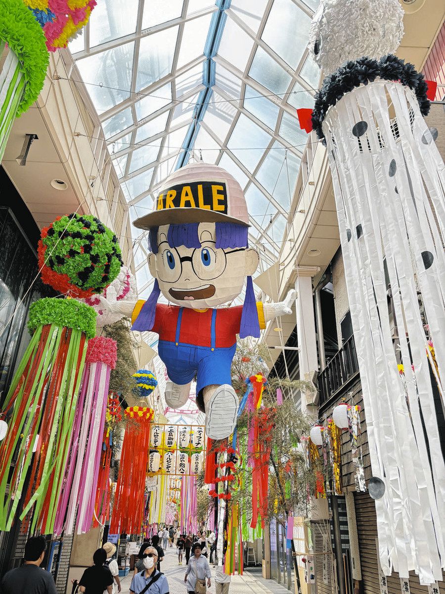 全長約700メートルの商店街では、「Dr.スランプアラレちゃん」「紅の豚」といった人気アニメのキャラクター、巨大なたい焼きなど約90体の張りぼてがお出迎え。商店主や地元の小中学生、有志らが針金や木で骨組みを作り、和紙を貼ってペンキで色を塗って作った。