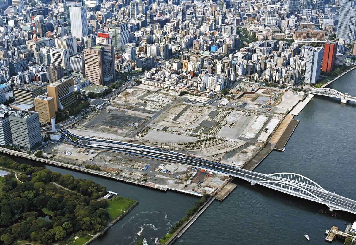 庭園「浴恩園」の遺構が見つかった築地市場跡地(中央)。左手前は浜離宮恩賜庭園=東京都中央区で、本社ヘリ「あさづる」から