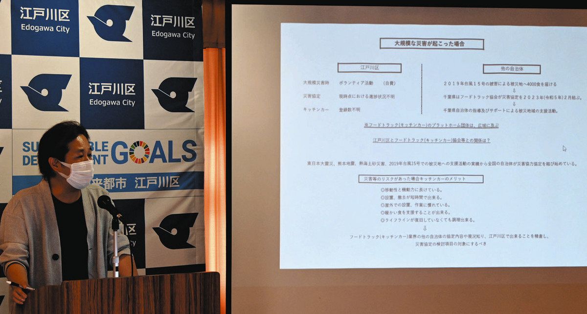 昨年8月、政策提案プレゼンで災害時のキッチンカー活用を提案する古賀弘之さん=江戸川区で