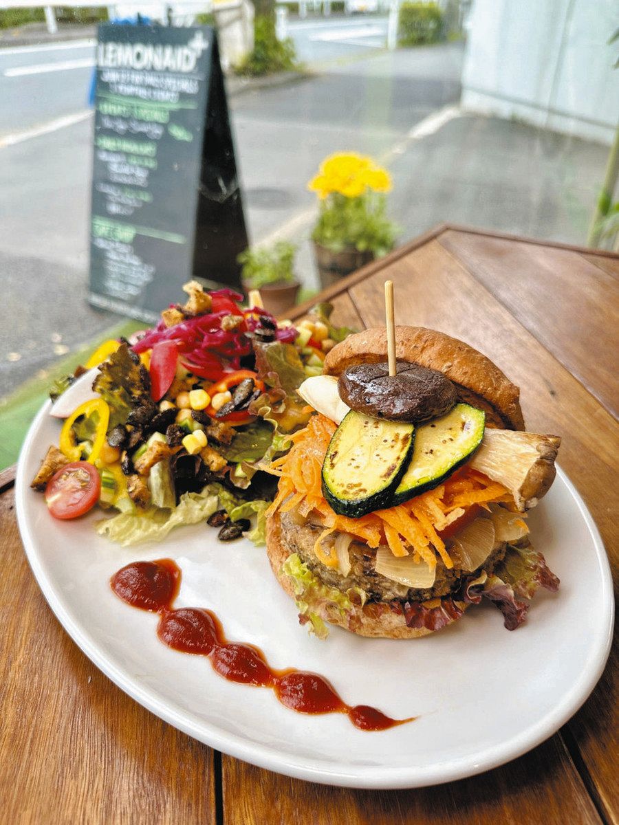 写真(下)は「ベジバーガープレート」(1600円)。本店で長年人気のメニュー。パティはマッシュルーム、ひき割り小麦、タマネギ、セロリ、ニンジン、オーツ麦を使用。具材にはシイタケ、エリンギ、ズッキーニ、トマトを挟み、分厚くボリューミー。もちろんバンズの小麦粉も含めてオーガニック。ヘルシーな上に、ガッツリ食べられるランチメニューだ。