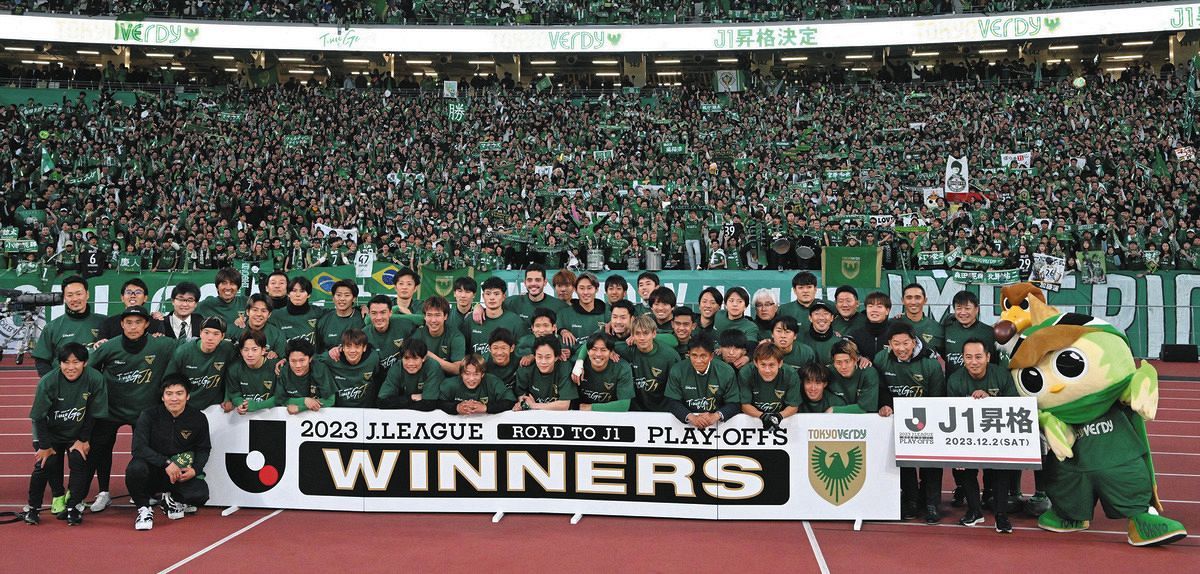 J1昇格を決め、サポーターと一緒に喜ぶ東京Vイレブン=2023年12月2日