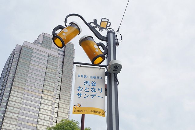 恵比寿駅東口近くの「ビール坂」にはビールジョッキの形をした街路灯が並びます。工場で製造したビールを、馬車を使って運搬していたことから名付けられました。