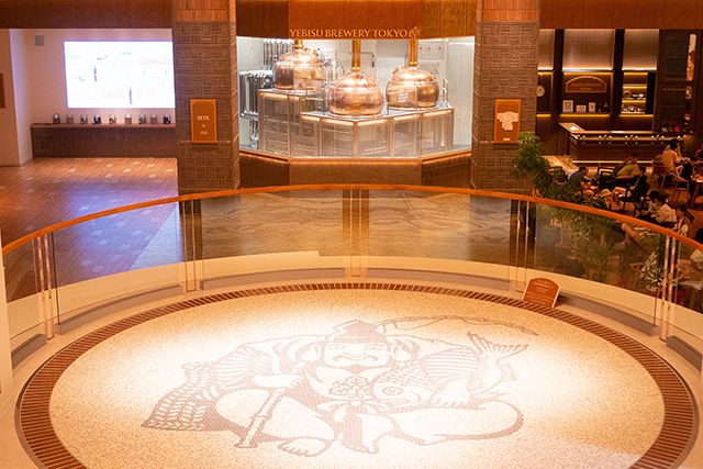 恵比寿駅東口から歩いて5分ほど。エントランスを抜けると、モザイクアートで大きく描かれた恵比寿様がお出迎え。入場は無料で、ツアー利用時のみ予約が必要です。