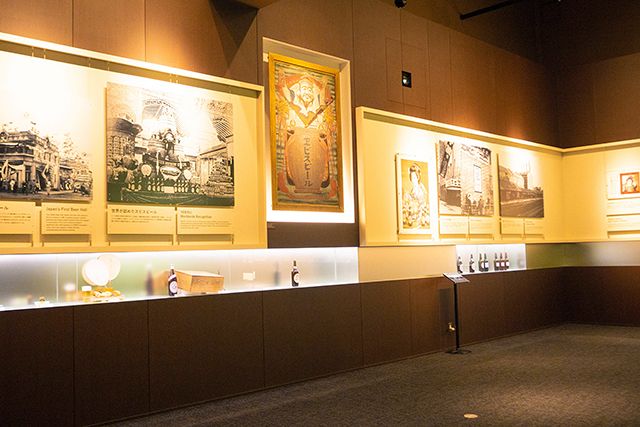 明治33年(1900年)頃に実際に使われていた看板のほか、歴史あるポスターやパネル写真、発売当初の瓶、蓋付ビールジョッキなどが展示されています。
