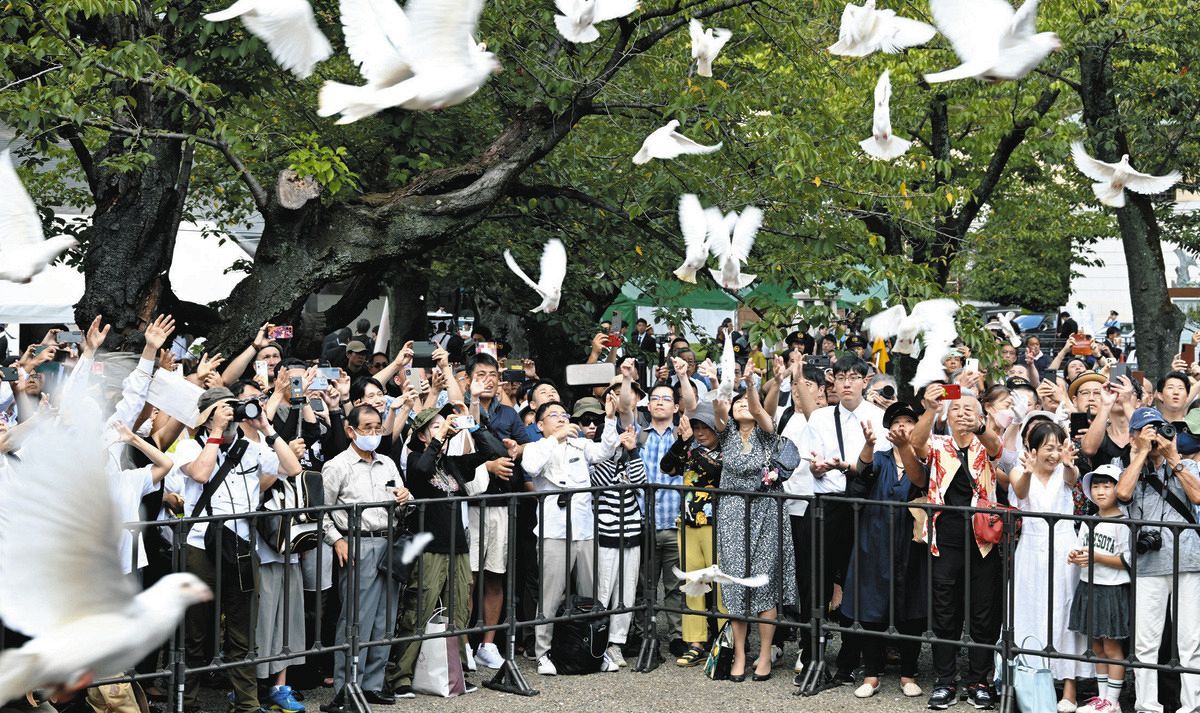 10時拝殿近くで宮司の発声とともに参拝者がハトを空に放つ。埼玉県越谷市立大相模中2年の千野碧音(あおと)さん(14)は「鳥と神社が好きで来た。モフモフしてかわいかった」と喜ぶ。今も続く戦争について聞くと少し悩み「なんでやっているんだろうと思う」。