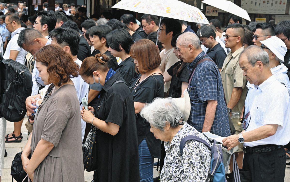 12時黙とう。東京都足立区の公益財団法人職員、田山拓良さん(68)は2017年に92歳で亡くなった父・喜重さんに思いを寄せた。「無線技士として乗っていた船が攻撃され3日間残骸につかまり生き延びた」という話を毎年聞かされた。「照れくささもあって別々に参拝していたけど、一緒にしてもよかったかな」。世界情勢に触れ「武器を持ち抑止力を持つことは必要だがエスカレートしても戦争になる。微妙なバランスを保たないと」。