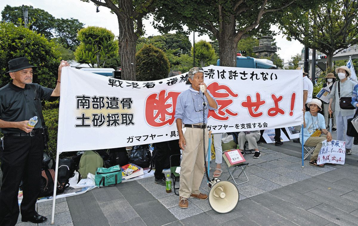 13時40分「戦没者を助けてください」。沖縄戦の遺骨収集ボランティア「ガマフヤー」代表の具志堅隆松さん(70)が、境内までの通り道で呼びかけた。遺骨が残る沖縄本島南部の土砂を基地建設に使う計画に反対している。「首相が戦没者に哀悼の誠をささげながら、遺骨を海に捨てるというのは矛盾だ」。立ち止まった男性が「沖縄には行けないけど応援している」と握手を求めた。