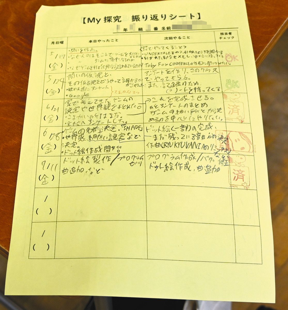 生徒たちはその日の取り組みと次回の予定を毎回「振り返りシート」に記入し、教員のチェックを受ける=一部画像加工