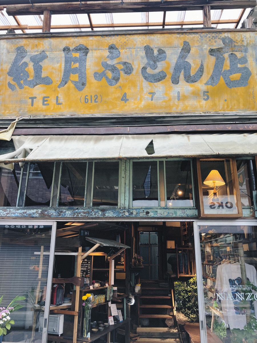 京島在住の土井靖子店長(49)によると、ギャラリーの入る木造2階建て建物は1923年の関東大震災直後に建てられたという。1階のひさしの上には「紅月ふとん店」と書かれた看板が残る。