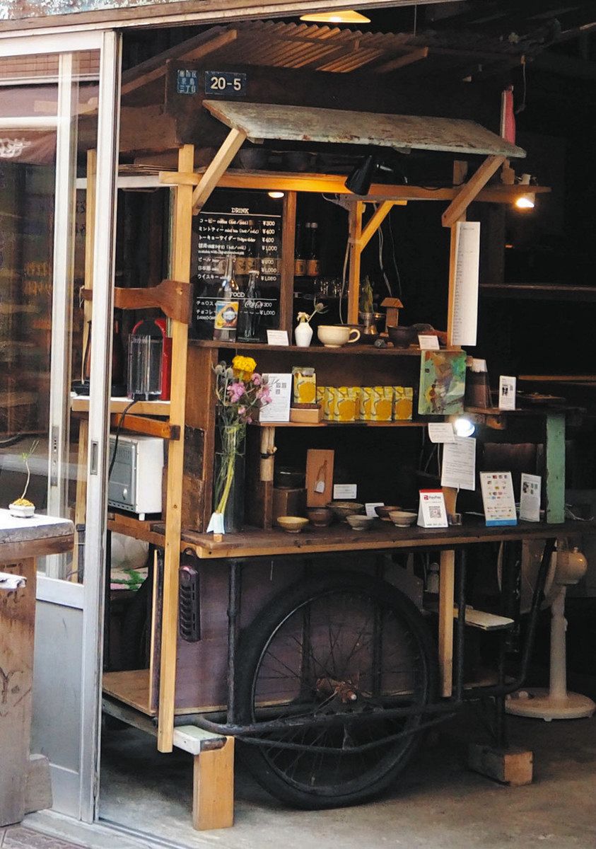 建物をギャラリーに改修する際、地域で出た廃材を使うことを心がけたという。展示台には建物解体などで不要になった板を利用し、飲み物を提供したり会計をしたりするカウンターは古いリヤカーを改造した。新たに設けた茶室の天井代わりに置かれた穴の開いたトタン板も味わい深い。