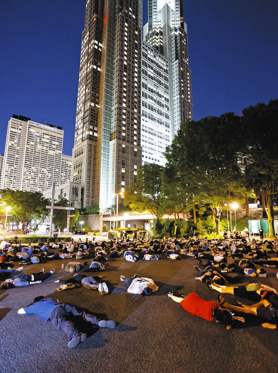 東京都庁(後方)へ向け「ダイ・イン」で抗議する人たち=2023年9月1日、東京都新宿区で