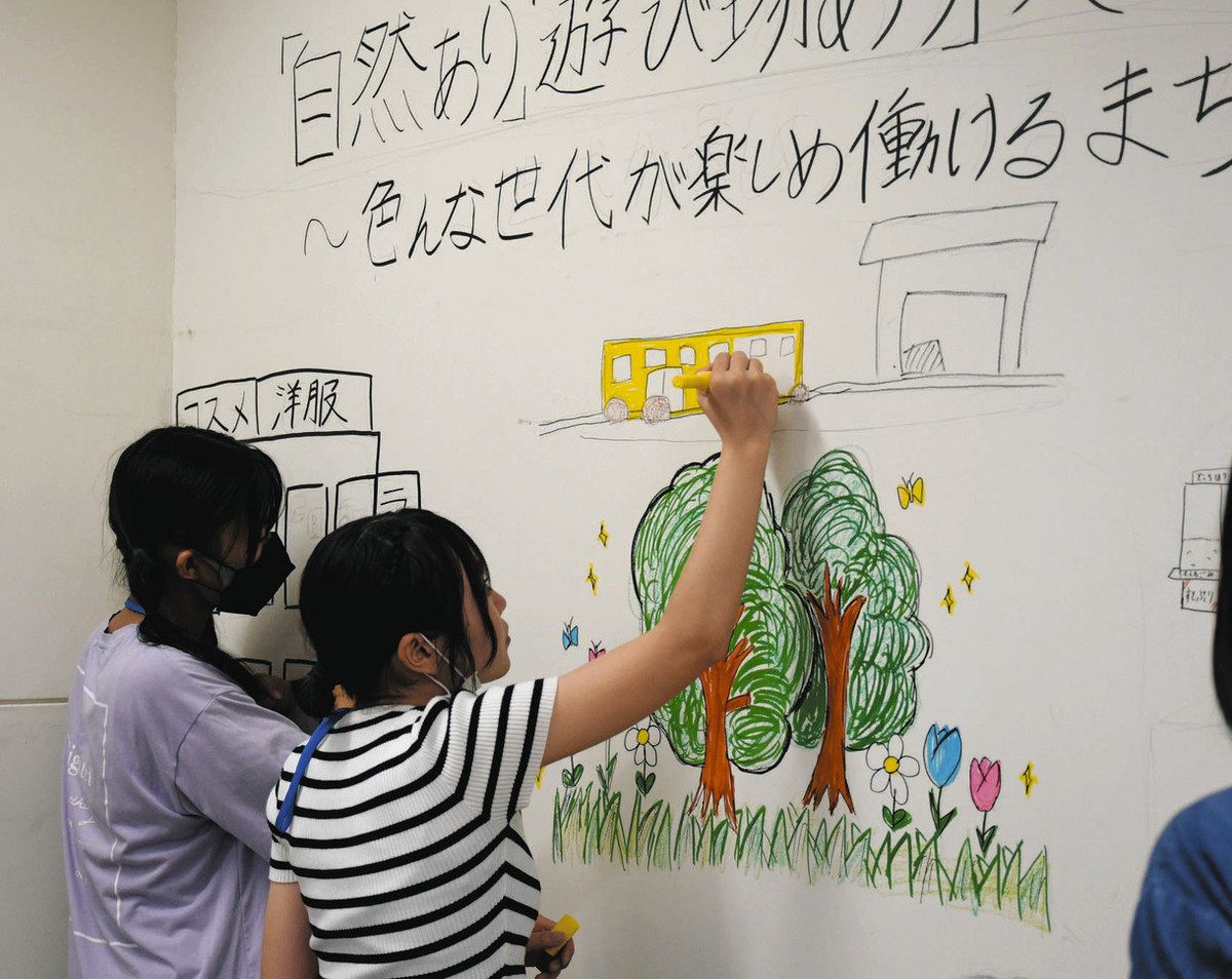 役目を終えた北庁舎に3日、小学生~20代の若者約30人が集まった。六つのグループに分かれて話し合い、これからのまちの姿や未来への思いなどを絵やメッセージで描きあげた。