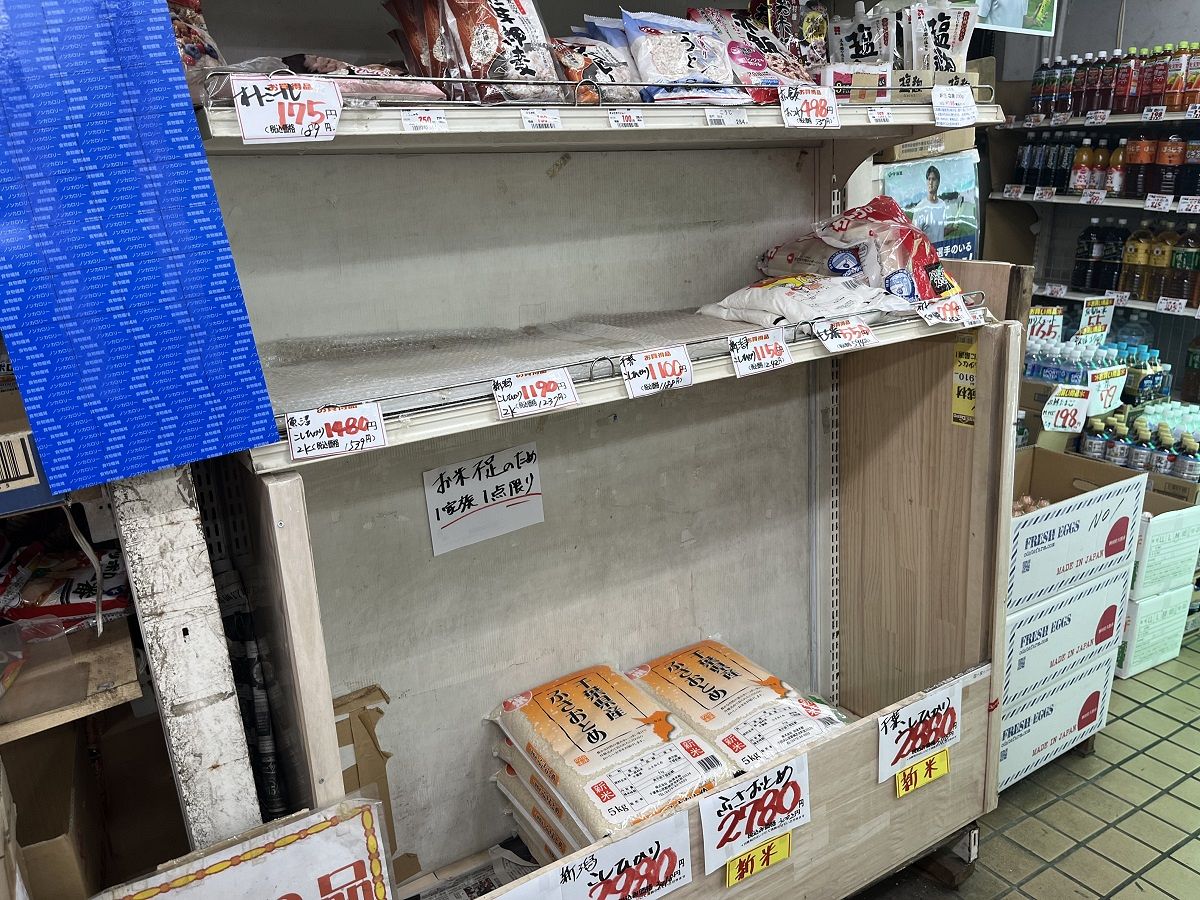 ある店舗では、もち米と玄米が少し残っているだけで、白米のコーナーはからっぽ。「あら、ここもない」と、女性客が足早に去って行った。
