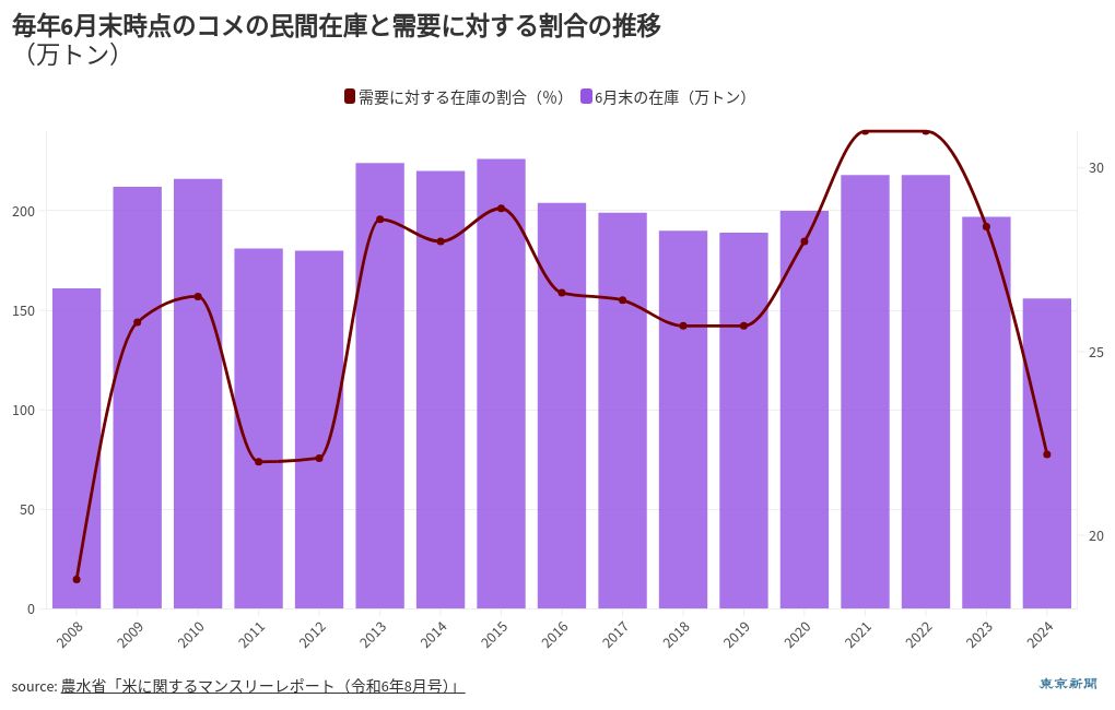 農水省のまとめでは、新米が出回る前の6月末時点で卸業者や小売業者などが抱える「民間在庫量」は、前年同月より41万トン少ない156万トン。比較可能な1999年以降で最も少なかった。昨夏の猛暑と渇水で品質が低下し、市場に出回る量が減ったことなどが影響した。