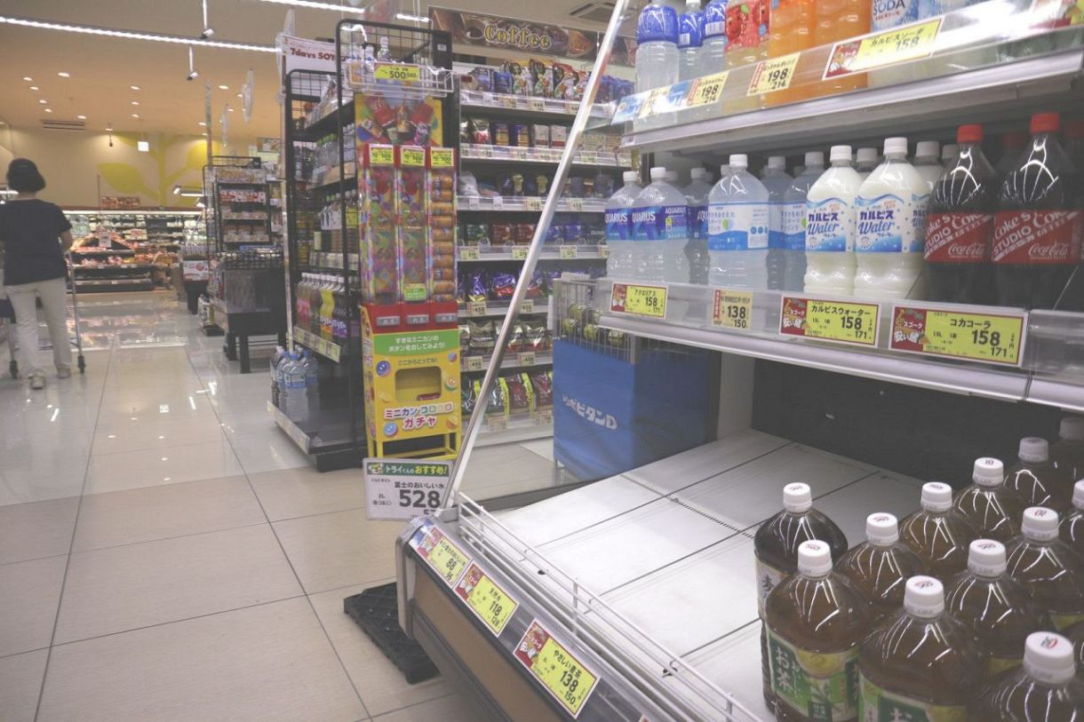 南海トラフ地震に向けた注意報が発令された際には、ペットボトルの飲用水が完売する店も相次いだ=9日、三重県内のスーパー