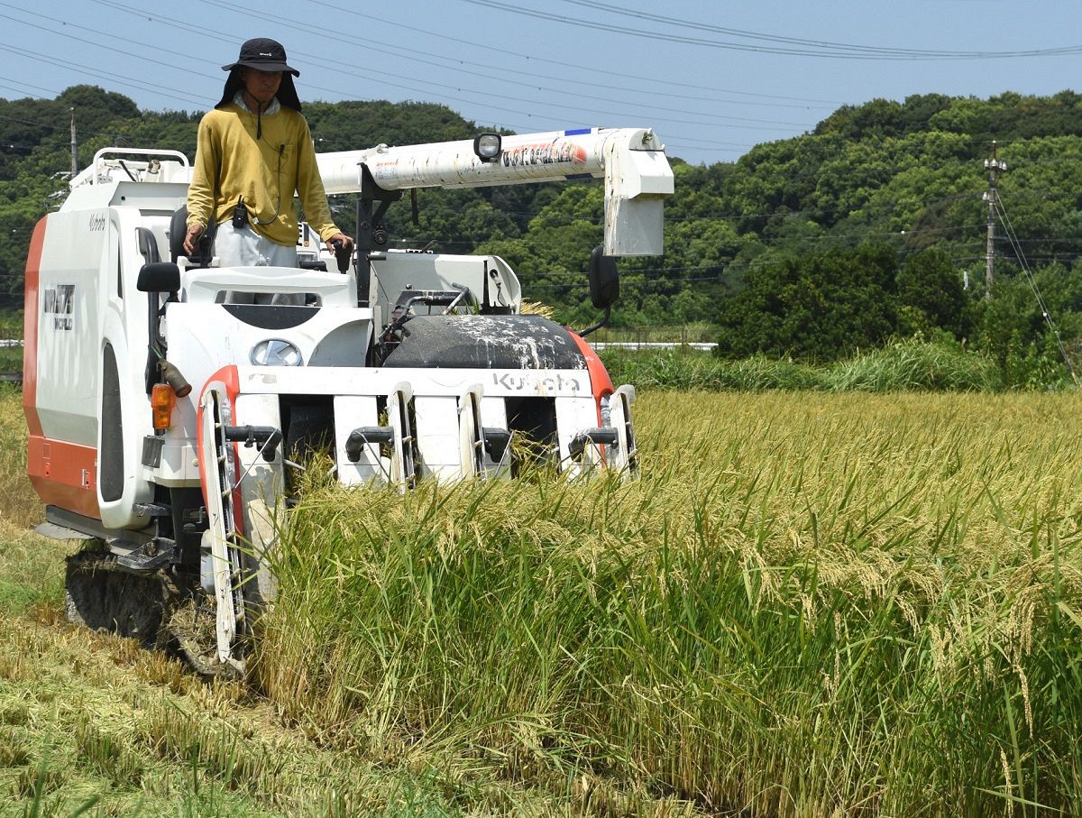 猛暑の中で始まった稲刈り =14日、愛知県阿久比町