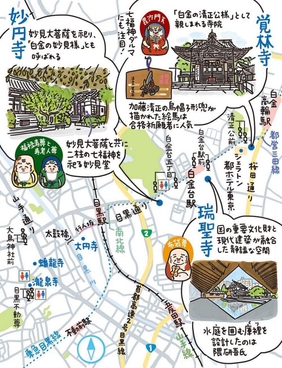 社寺が混在することも多い七福神巡りですが、山手七福神巡りは寺院のみで構成されています。妙円寺に二柱の七福神(福禄寿尊と寿老人尊)が祀られているため、6寺を巡れば、すべての七福神にお参りできます。港区(白金台)と目黒区(下目黒)に3寺ずつあり、港区から目黒区の順番で参拝すると無病息災・長寿のご利益が、目黒区から港区の順番で参拝すると商売繫盛のご利益があるのだとか。