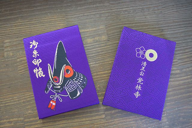 「御朱印帳」(各1500円)。加藤清正のトレードマークである烏帽子形兜に注目。色違い(朱色)もあります。