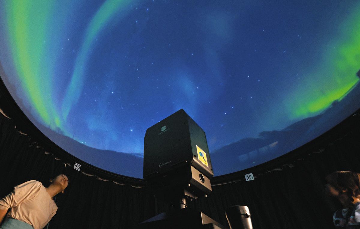 6席だけの小さなスペース。直径4メートルの半球状のスクリーンには現在、2009年に北極圏のノルウェー・トロムソで撮影されたオーロラが約8分間の映像にまとめられ、上映されている。美しく輝き、少しずつ形を変える神秘的なオーロラの姿は圧巻だ。