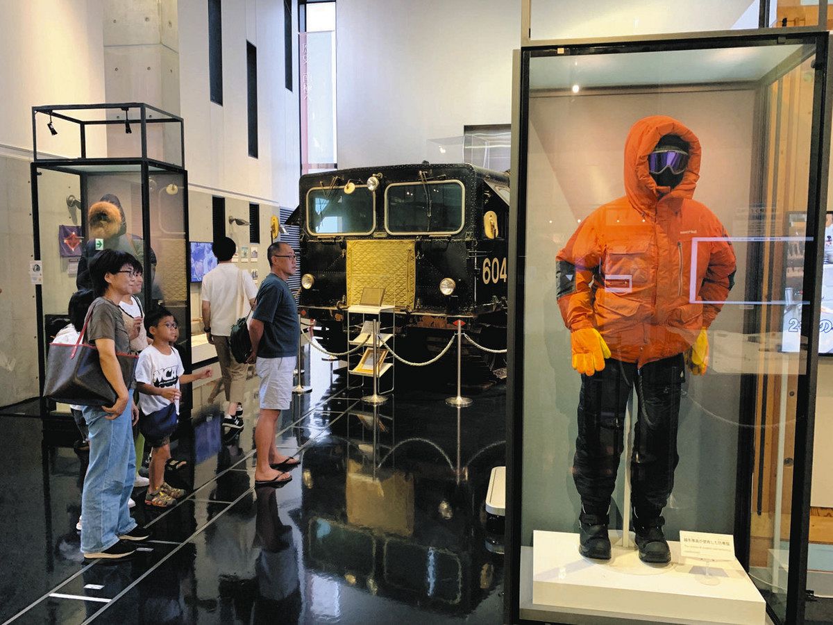 南極観測に使われた防寒着や雪上車など展示品を見る来場者