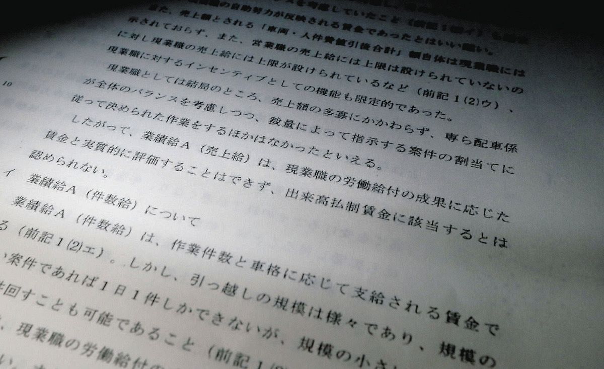 残業代訴訟の一審の判決文。「出来高払制賃金に該当するとは認められない」と記されている