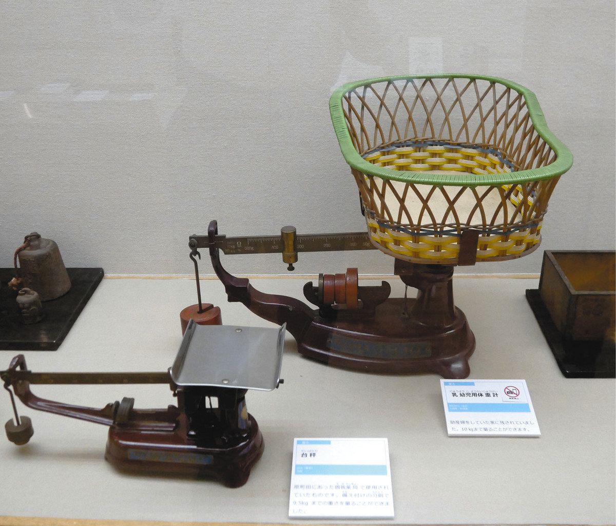 乳幼児用体重計(右)と台ばかり(左)=いずれも町田市立自由民権資料館で