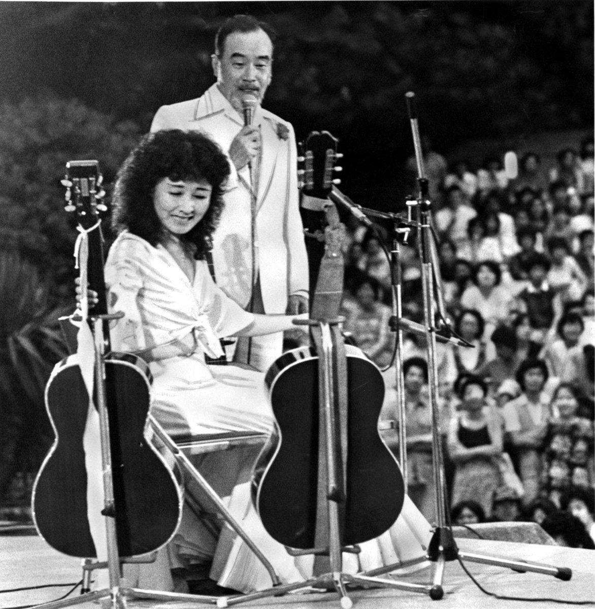 「知床旅情」を歌った森繁久弥さん(右)と加藤登紀子さん=1979年7月、日比谷野外音楽堂で