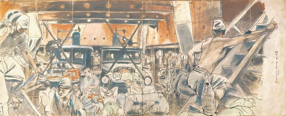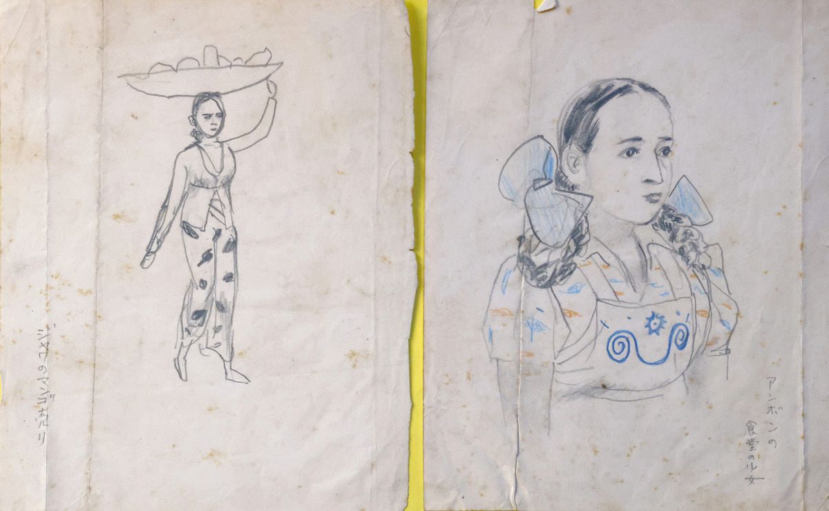 インドネシアのバタビア(現在のジャカルタ)―スラバヤ間で、船内の様子を描いたとみられる。下描きのスケッチもあり、兵士らの様子を丁寧に描こうとしたことが伝わる。
