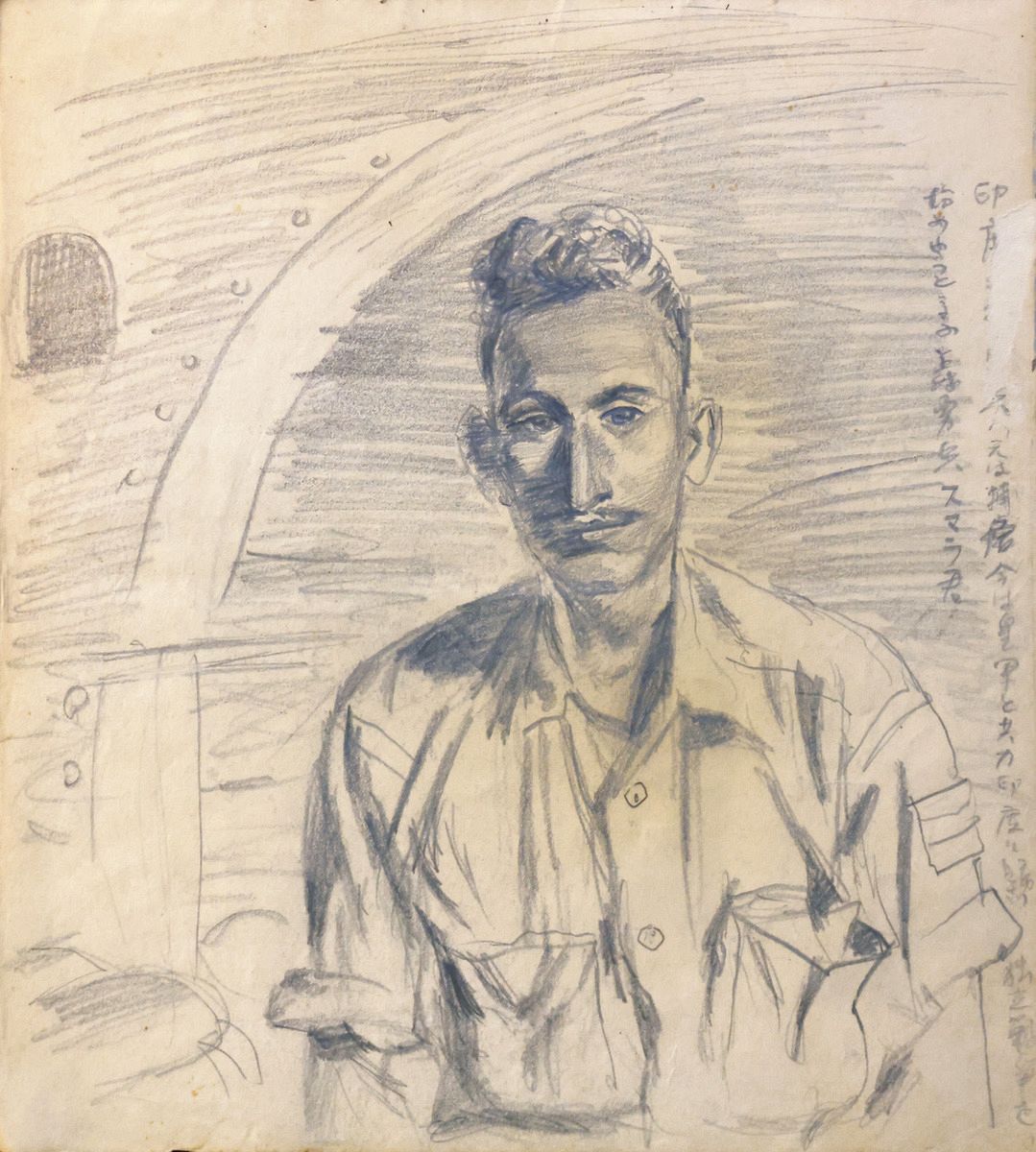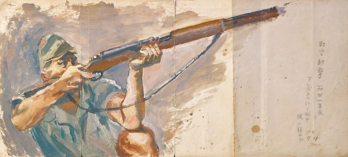厳しい目つきで銃を構える日本兵。他にも仲間の兵士を描いた絵が多数あった。義子さんは「いつ死ぬか分からない状況の中で、若者たちは故郷の家族のために、自身の姿を描いてほしいと父に頼んだのではないか」と思いをはせる。