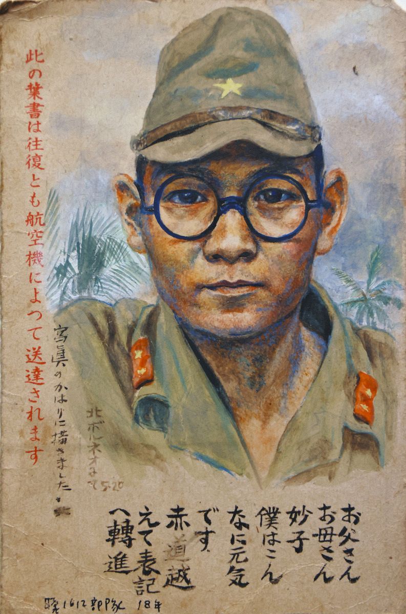1943年、石津さんがボルネオ島から故郷の家族に送ったはがきには「寫眞(写真)のかはりに」と自画像が描かれていた。「僕はこんなに元気です」とも記され、豊かな色づかいが目を引く。