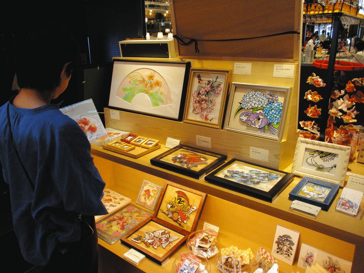 現代美術家で金魚絵師の深堀隆介さんら作家11人の作品や、関連グッズなど計約80種類が並んでいる。金魚を描いた油絵や切り絵などで会場は涼やかな雰囲気に。ぐいのみのガラス工芸品などもあり、観光客らの注目を集めていた。