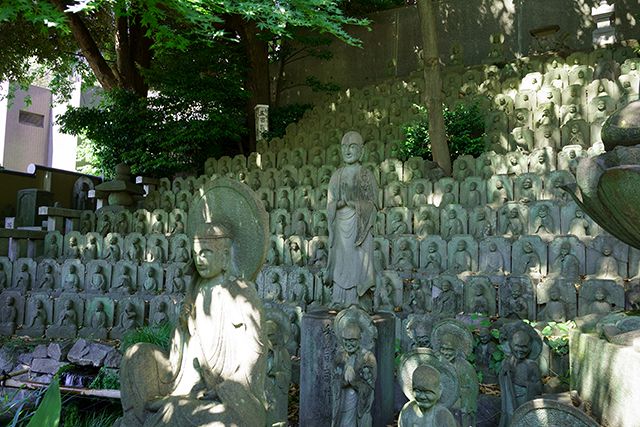 1体ごとに異なる表情の五百羅漢像。赤ん坊を抱いた女性の羅漢像もあり、キリスト教の聖母像を連想させます。五百羅漢像を中心とした石仏群は、東京都の有形文化財に指定されています。