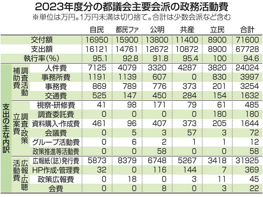 政活費は議員1人につき月50万円を各会派に交付。2023年度は交付総額の94.6%を使い、余った3871万円余が都に返還された。使用率(執行率)が前年度を上回るのは4年ぶり。