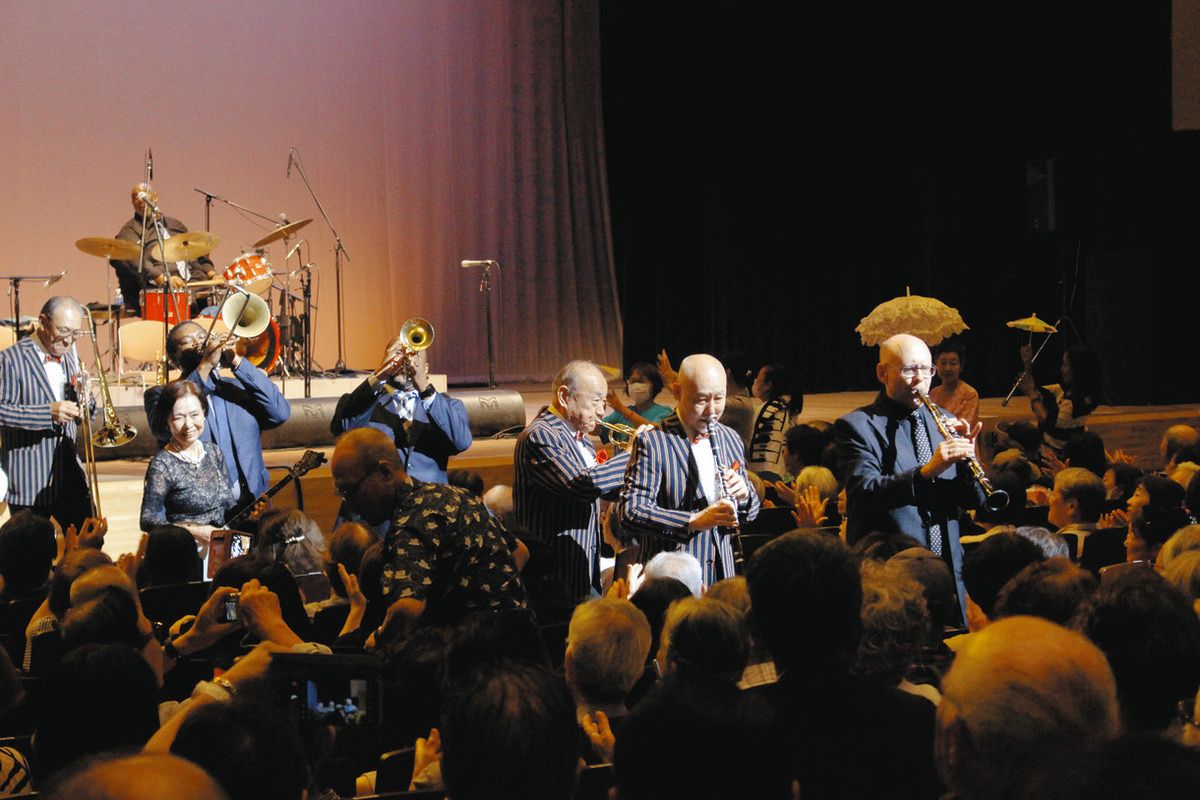 クラリネット奏者トーマス・フィッシャーさんらのバンド「ニューオーリンズジャズオールスターズ」が出演し、「A列車で行こう」「虹の彼方に」などの名曲を演奏。歌のパートや各奏者のソロの見せ場もあった。最後の「聖者の行進」はバンドが客席を練り歩き、観客と一体となった。