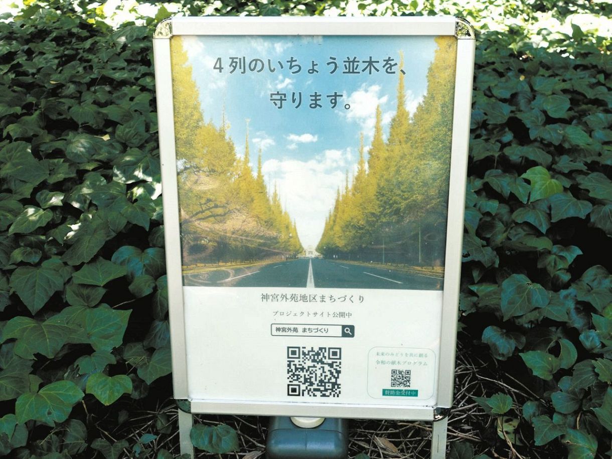 4列のイチョウ並木の近くには「守ります」と書かれた看板が置いてある