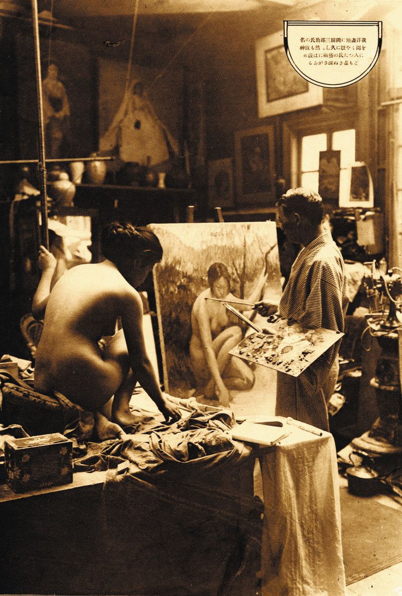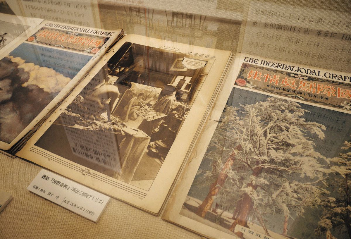 写真は、23(大正12)年に発行された雑誌「国際書報」に掲載されたもので、今年3月に区民が同館に雑誌を寄贈した。岡田の作品「萩」や「白衣の少女」が飾られた部屋に、絵筆を持つ岡田と女性モデルが写っている。